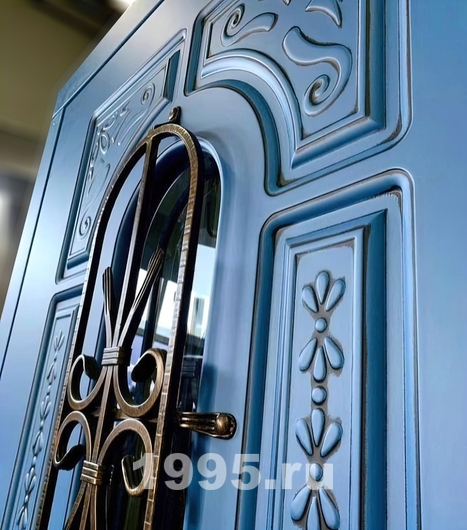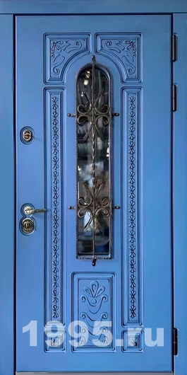 Синяя дверь окрас по RAL, с ажурным рисунком, стеклом и ковкой