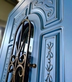 Синяя дверь окрас по RAL, с ажурным рисунком, стеклом и ковкой