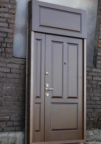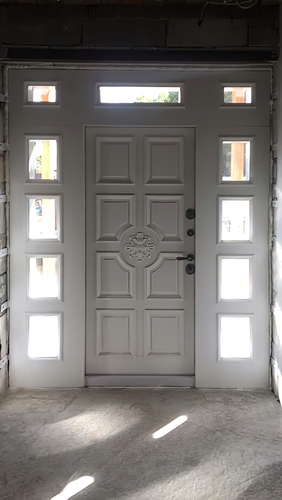 Парадная дверь с карнизом, стеклопакетами, отбойниками
